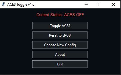 ACES Toggle is a lightweight Windows utility designed to easily switch between ACES color management configurations and sRGB. It updates the OCIO environment variable, allowing visual effects artists and colorists to toggle color workflows without manually editing system variables.